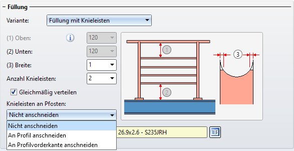 Für Füllungen mit Knieleisten ist auf der Registerkarte Füllung die Checkbox An Pfosten anschneiden durch eine Auswahlbox ersetzt worden.