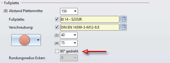 Wird für rechteckige oder runde Fußplatten als Bohrungsraster die 2er Bohrung gewählt, dann ist es ab HiCAD 2022 SP1 möglich, die Fußplatte um 90° zu drehen.