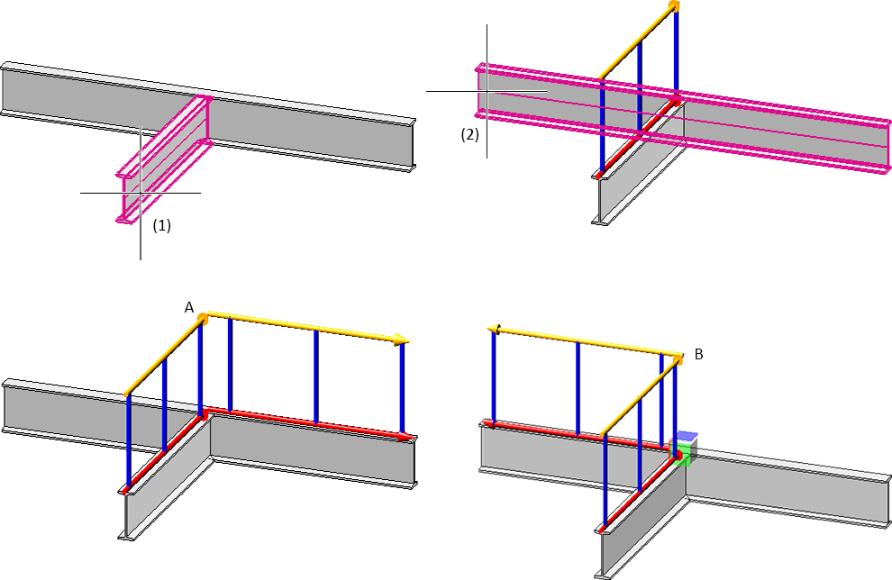 Im abgebildeten Beispiel ist das erste Profil an Punkt (1), das zweite Profil an Punkt (2) ausgewählt worden. A zeigt das Ergebnis vor HiCAD 2022 SP1, B das Ergebnis in HiCAD 2022 SP1.