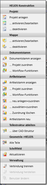 - Auch für die Konstruktion (RMT auf den Konstruktionsnamen im ICN oder auf einen leeren Bereich der Zeichenfläche) oder für 2D-Teile stehen analoge Kontextmenüs mit HELiOS-Funktionen zur Verfügung.
