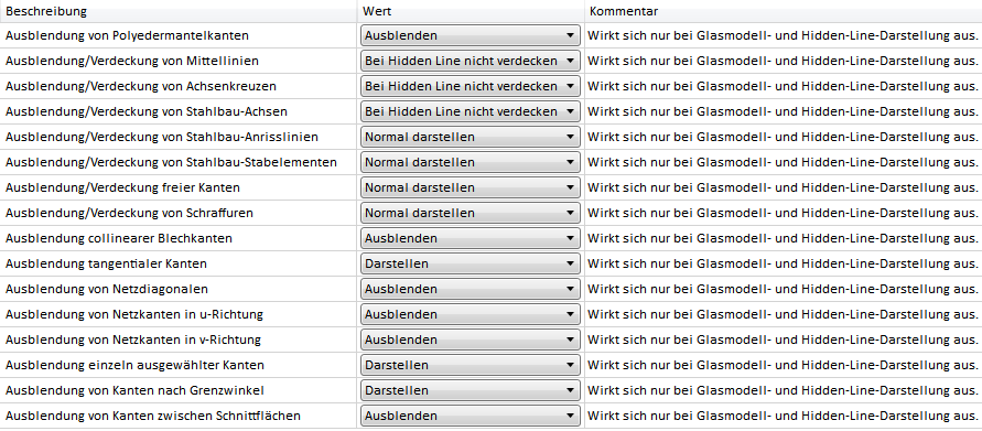 Hier bestimmen Sie die Voreinstellungen für die Funktion elemente ein-/ausblenden in Ansicht. Beachten Sie, dass sich die Einstellungen nur auf die Glasmodell- und die Hidden-Line-Darstellung auswirken.