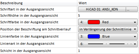 Unter Schnitte legen Sie die Kennzeichnung des Schnittes in der Ausgangsansicht fest. Dies sind die Schriftart, -höhe und -farbe, die Position der Beschriftung am Schnittverlauf sowie die Linienfarbe, Linienart und Schicht. Die Einstellungen werden als Voreinstellungen des Dialogfensters Kennzeichnungseinstellungen bei der Definition von Schnittansichten verwendet.