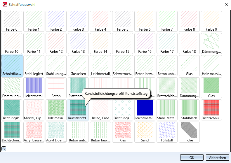 . Das Dialogfenster Schraffurauswahl wird angezeigt. Wenn Sie mit demCursor auf eines der Muster zeigen werden weitere Informationen zum Schraffurmuster angezeigt. Mit einem Klick auf das Lupensymbol unten links lässt sich die Anzeige der Muster auch zoomen.