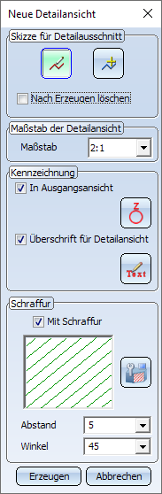 Die Einstellungen für Detailansichten legen Sie im Dialogfenster Neue Detailansicht fest, das nach dem Aufruf der Funktion Detailansicht automatisch angezeigt wird.