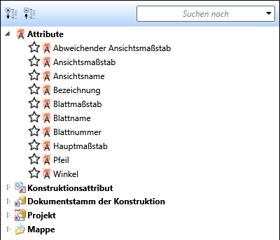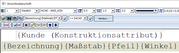 Bestimmen Sie die Komponenten, die in der Überschrift ausgegeben werden sollen. Dies können feste Texte oder Attribute sein. Beispielsweise lassen sich der Ansichtsname, die Bezeichnung, der Maßstab und - bei nicht in Fluchtrichtung abgeleiteten Ansichten - Pfeil und Winkel in die Überschrift übernehmen.