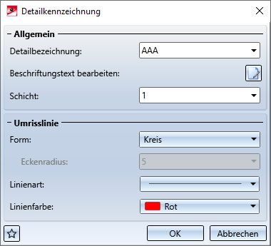 Über die Schaltfläche Text- und Linienparameter ändern lässt sich Sie die Kennzeichnung des Details in der Ausgangsansicht individuell festlegen. |
