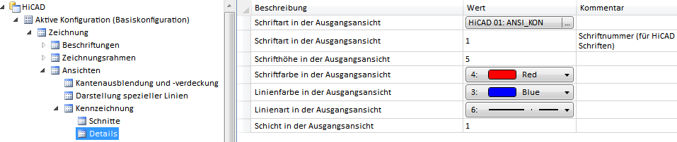 Die Darstellung der Detailansichtskennzeichnung sowie Schriftart, -höhe und -farbe der Kennzeichnung richten sich nach den Einstellungen im Konfigurationsmanagement unter Zeichnung > Ansichten > Kennzeichnung > Details. Dort können Sie die Schriftart, -höhe und -farbe sowie die Linienfarbe, Linienart und Schicht in der Ausgangsansicht festlegen.