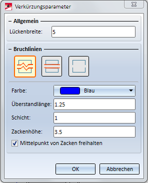 Für Zickzacklinien lassen sich Farbe, Schicht und Überstand sowie die Zackenhöhe festlegen. Durch Aktivierung der Checkbox Mittellinie von Zacken freihalten lässt sich erreichen, dass bei ungerader Zackenanzahl die Zacken so angeordnet werden, dass auf dem Mittelpunkt der Bruchlinie kein Zacken liegt. In diesem Fall werden die Zacken auf der Bruchlinie verschoben. Grund: Abgeschnittene Mittellinien treffen häufig genau auf den Mittelpunkt der Bruchlinie. In diesem Fall sollte hier kein Zacken liegen. |