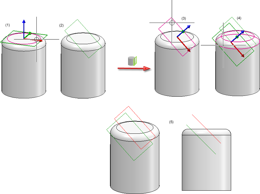 Ein Beispiel: Die Abbildung zeigt einen Zylinder mit gerundeter Deckfläche. In diese Deckfläche wurde eine Bearbeitungsebene gelegt (1), die um 45° um die Y-Achse gedreht worden. Es soll nun eine Bearbeitungsebene angelegt werden, die tangential an die Rundungsfläche anschließt und parallel zur bereits vorhandenen Ebene ist. Dazu wird die Funktion Tangential an Fläche /Parallel zu Ebene aufgerufen. anschließend wird zuerst due vorhandene Ebene (3) ausgewählt und dann die Rundungsfläche (4). Unter (5) sehen Sie die erzeugte Ebene in der Axonometrie und in der Vorderansicht.