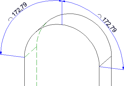 Bogenmaß über Punkte/Kanten/Fläche ermittelt das Bogenmaß eines Bogen- oder Zylindersegmentes. Die Maßhilfslinien liegen parallel zur gedachten Winkelhalbierenden des Kreissektors und beginnen an den Bogenendpunkten. Maßlinie und Bogen sind konzentrisch. |