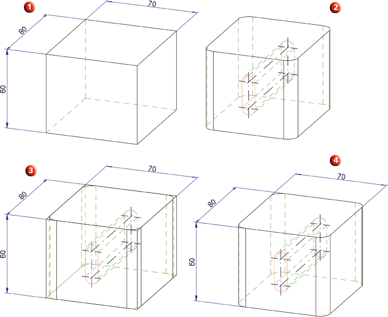 (1) Ausgangsteil mit Bemaßung, (2) Austauschteil (3) Übereinanderliegendes Ausgangs- und Austauschteil, (4) Austauschteil mit übertragener Bemaßung