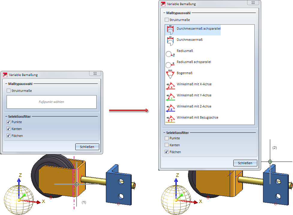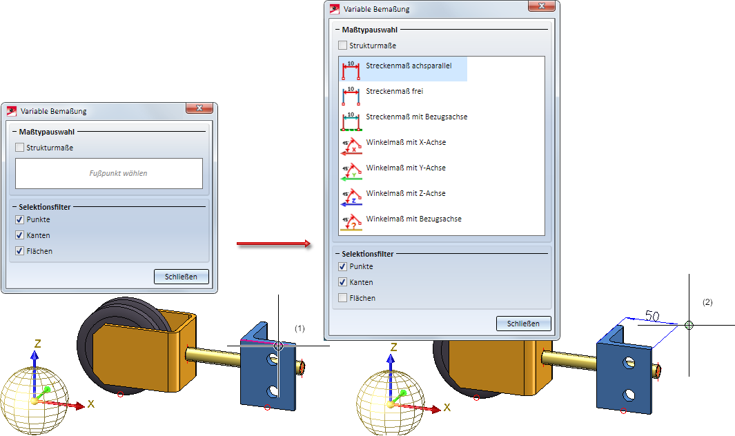 In der folgenden Abbildung ist nach dem Aufruf der Funktion die markierte Kante (1) ausgewählt worden. Die variable Bemaßung schlägt dann als Bemaßungsarten die Strecken- und Winkelmaße vor (2).