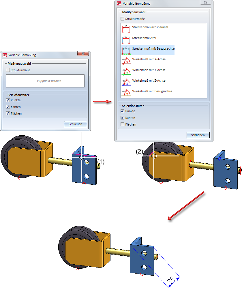 In der folgenden Abbildung soll eine Bezugsachse verwendet werden. Zunächst wird wie im Beispiel oben die Kante (1) und dann als Maßtyp Streckenmaß mit Bezugsachse gewählt. Anschließend wird die Kante (2) als Bezugsachse gewählt.
