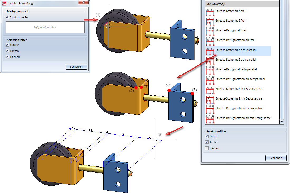 In diesem Beispiel wollen wir mit der variablen Bemaßung ein Kettenmaß erzeugen. Dazu aktivieren wir im Dialogfenster zunächst die Checkbox Strukturmaße. Anschließend wählen wir die Kante (1), als Maß Strecke Kettenmaß achsparallel. Dann werden die Folgepunkte (2) bis (5) gewählt. Anschließend wird das Maß abgesetzt (6).