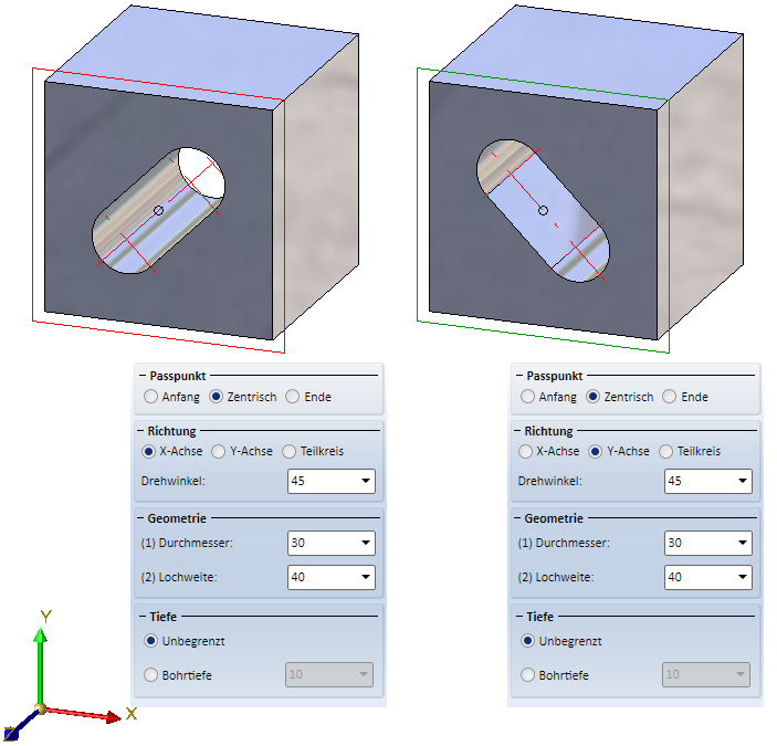 - Geben Sie falls gewünscht die Tiefe der Bohrung an oder aktivieren Sie die Checkbox Ganz durch.