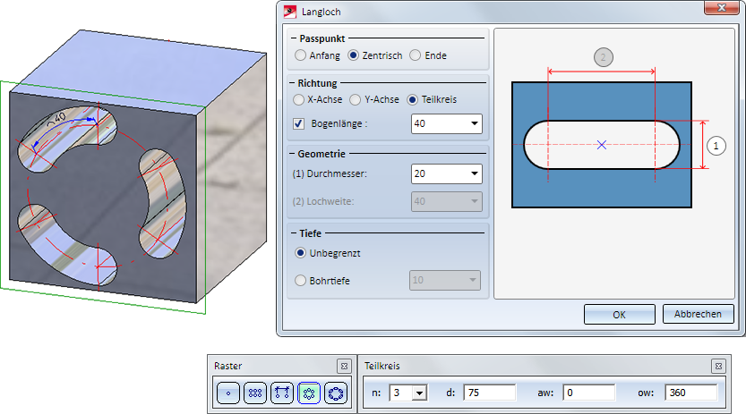 - Wählen Sie die Richtung für den Einbau und geben Sie - falls gewünscht - den Drehwinkel ein. Alternativ können Langlöcher auch entlang eines Teilkreises angeordnet werden. Ist die Option Teilkreis aktiv, dann geben Sie anstelle des Drehwinkels die Bogenlänge des Langlochs an.