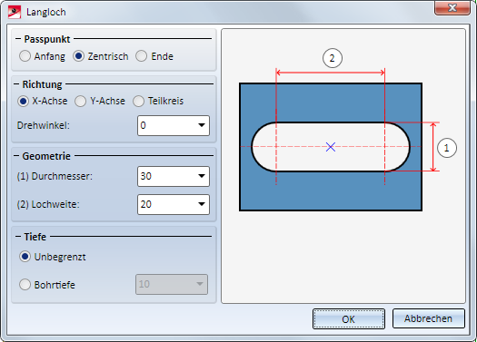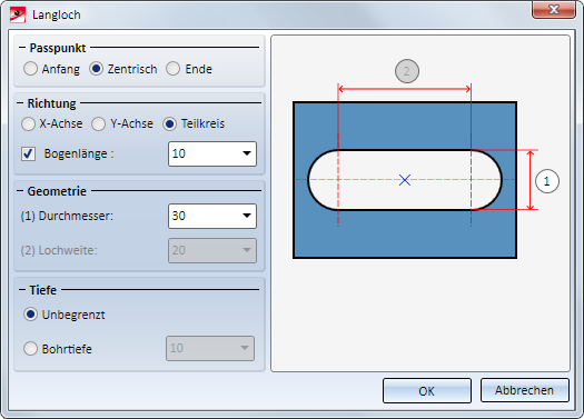 - Nach dem Aufruf der Funktion und je nach gewählten Einstellungen erforderlichen Dialogschritten wird das Dialogfenster Langloch angezeigt.