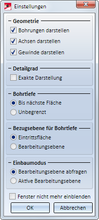 Mit dieser Funktion legen Sie die Einstellungen für den Einbau von Bohrungen fest.