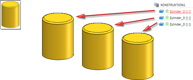 Ist dies der Fall, dann kann direkt gespeichert werden. Dies führt dazu, dass, wenn mehrere „Geschwister“ eines Gleichteils unterschiedlich geändert werden, die Änderung bei den anderen bereits geänderten Geschwistern verloren geht. Wenn also beispielsweise ein Gleichteil eine Fase und ein anderes Gleichteil desselben referenzierten Teils eine Rundung erhalten hat, dann geht eine der beiden Änderungen verloren. Ist dies nicht der Fall, d. h. das Teil ist „nicht modifiziert“ oder „nicht abgearbeitet“ worden, dann wird unter seinen Geschwistern nach einem „kürzlich modifizierten“ oder „abgearbeiteten“ Gleichteil gesucht. Sobald das erste Teil gefunden wurde, wird dieses gespeichert, unabhängig davon, ob noch weitere modifizierte Geschwister vorhanden sind. Ein Beispiel: In der folgenden Abbildung ist der referenzierte Zylinder dreimal eingebaut worden.