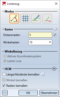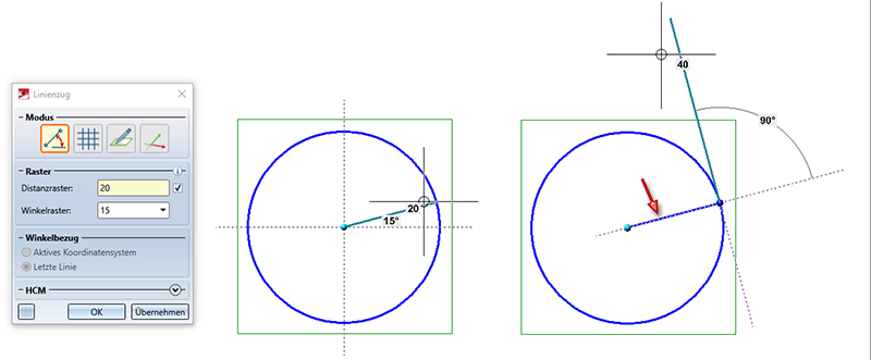 Beliebige Linien lassen sich auch tangential anschließen. Dazu muss aber für den der Winkelbezug die Option Letzte Linie aktiv sein.