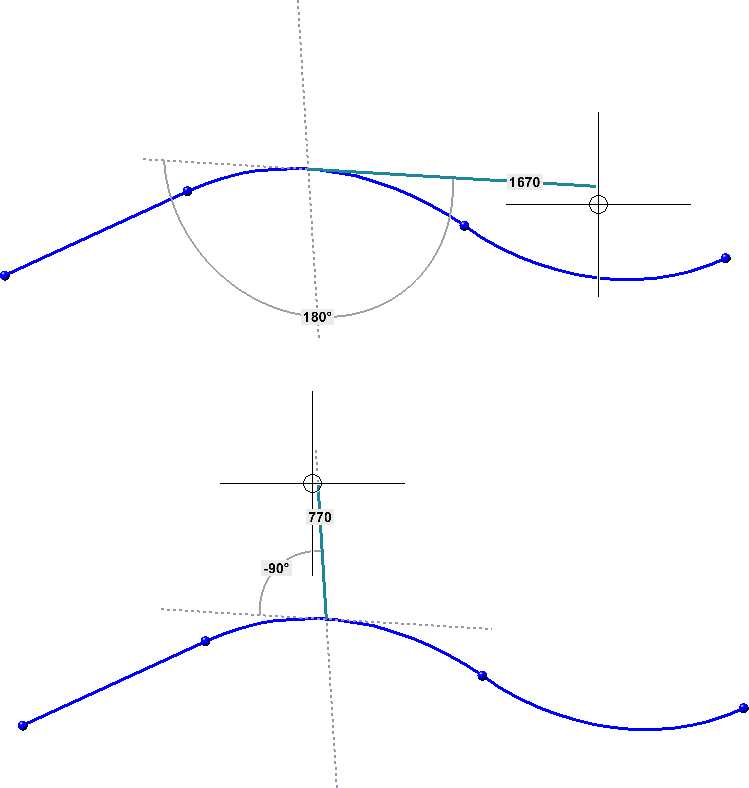 Um den Anfangspunkt der Tangente zu bestimmen, wählen Sie einen Punkt oder eine Linie. Der gewählte Punkt wird anschließend durch ein blaues Punktsymbol visualisiert. Bei einer Linienauswahl ist dies der dem Klickpunkt am nächsten liegende Punkt auf der Linie. Anschließend hängt eine dynamische Vorschau der Tangente am Cursor. Sie können dann analog den Endpunkt der Tangente bestimmen. Beachten Sie dabei, dass der blau markierte Punkt nicht unbedingt der tatsächliche Anfangspunkt der Tangente ist, sondern auch - je nach Cursorbewegung - die Projektion dieses Punkt in die Skizzenebene oder der nächstgelegen Tangentialpunkt sein kann.
