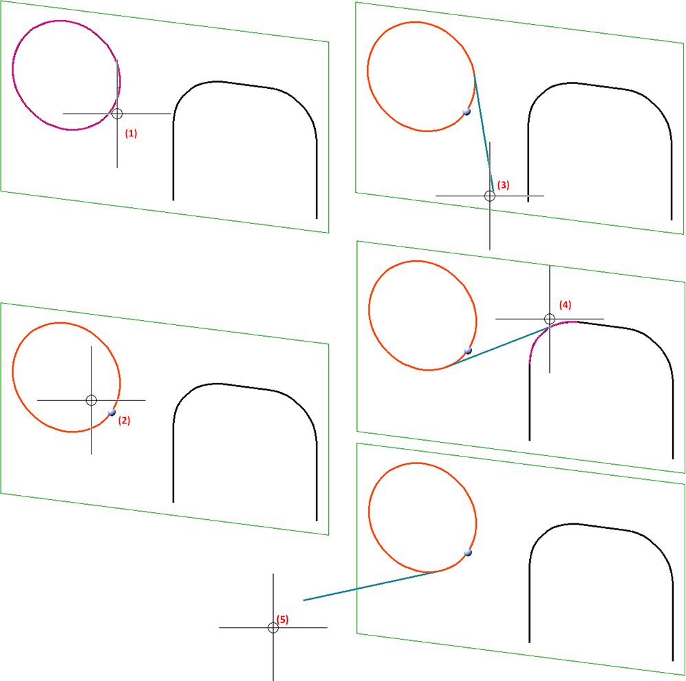 (1) Gewählte Linie, (2) Visualierter Punkt, (3) - (5) Beispiele möglicher Tangenten