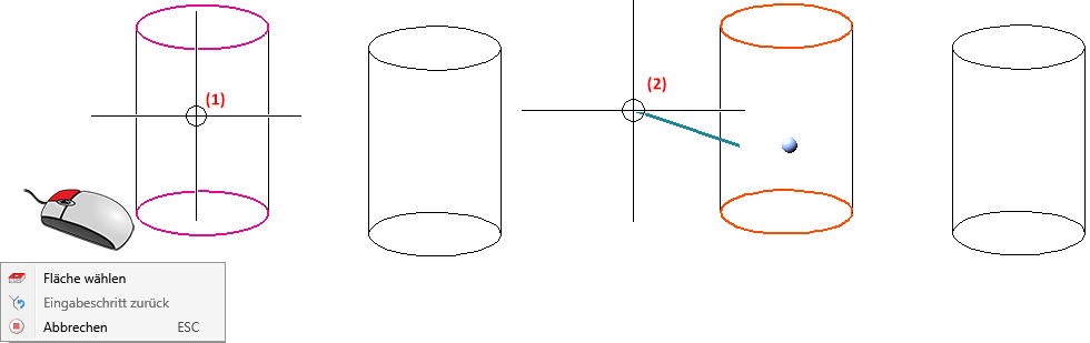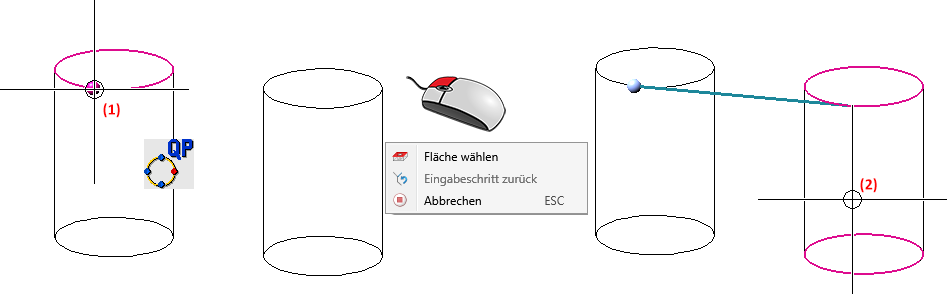 In der Abbildung ist der Anfangspunkt (1) gewählt worden. Dann wurde im Kontextmenü die Funktion Fläche wählen aktiviert und die Zylinderfläche (2) ausgewählt.