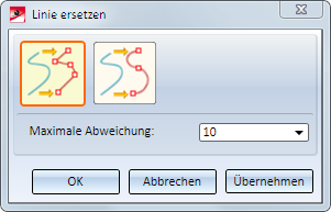 Mit OK wird die Approximation ausgeführt und die Funktion beendet. Mit Übernehmen wird die Approximation ebenfalls ausgeführt, aber die Funktion bleibt aktiv. Sie können dann weitere Kanten - auch mit geänderten Einstellungen im Dialogfenster - approximieren. Dabei können Sie auch Kanten zuvor ausgeführter Approximationen auswählen.