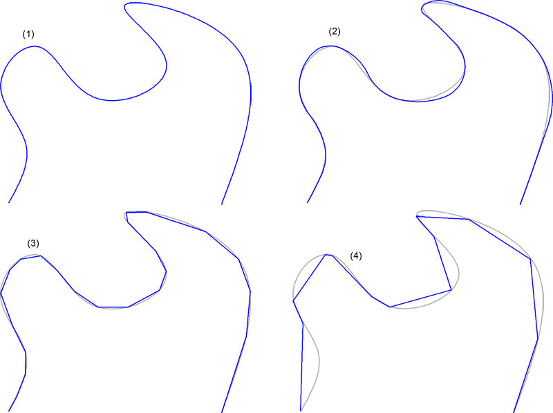 (1) Original, (2) ersetzt durch Kreisbögen, max. Abweichung 4, (3) ersetzt durch Strecken, max. Abweichung 2, (4) Ersetzt durch Strecken, max. Abweichung 10