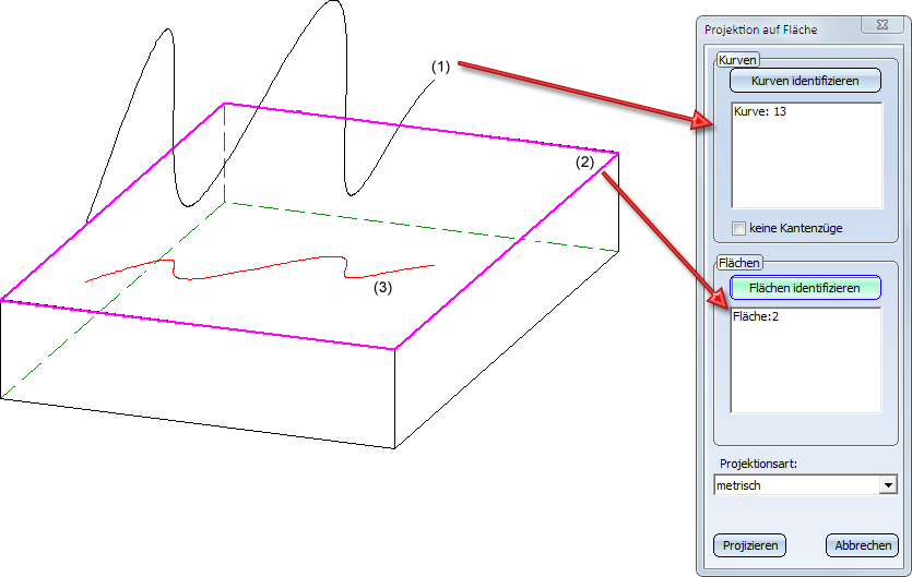 (1) Gewählte Kurve, (2) Gewählte Fläche, (3) Projektion - metrisch
