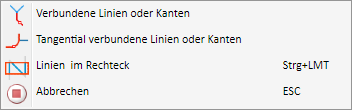 Identifizieren Sie nach dem Aufruf der Funktion die gewünschte Linie/Kante oder nutzen Sie die Funktionen des Kontextmenüs zur Auswahl. Sie aktivieren dieses Menü während der Auswahlphase mit der rechten Maustaste.