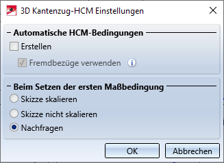 Soll das automatische Setzen von HCM-Bedingungen grundsätzlich abgeschaltet werden, dann müssen Sie in den HCM-Einstellungen unter Skizze > HCM > Tools die Checkbox Erstellen deaktivieren.