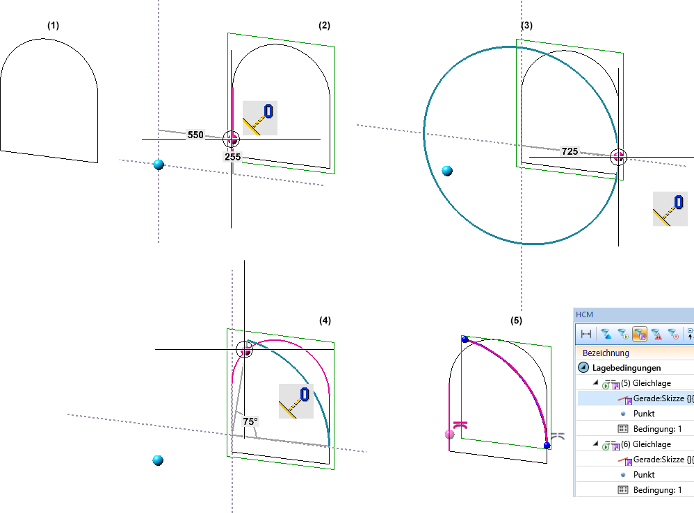 (1) Ausgangsskizze, (2) Bogenmittelpunkt, (3) Bogenanfangspunkt, (4) Bogenendpunkt, (5) Ergebnis mit Gleichlagenbedingung