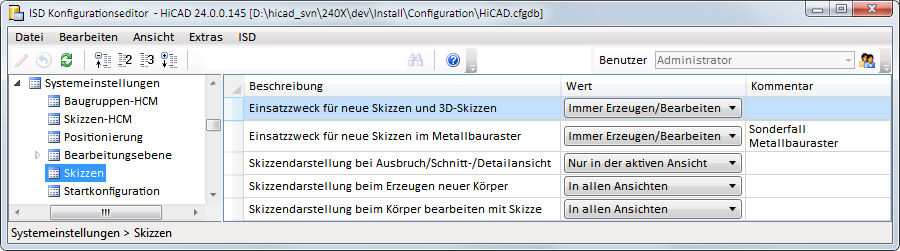Welche Einsatzzweck automatisch zugewiesen wird lässt sich im Konfigurationsmanagement unter Systemeinstellungen > Skizzen festlegen. Darüber hinaus kann hier auch festgelegt wie Skizzen dargestellt werden, die innerhalb anderer Funktionen entstehen oder verwendet werden, z-B. bei der Definition von Schnitt-/Detailansichten oder bei Erzeugung von Translations-/Rotationsteilen.