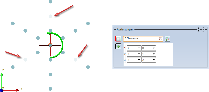Hier haben Sie die Möglichkeit, einzelne Kopien auszulassen, d. h. nicht zu generieren. Diese lassen sich sowohl in der Vorschau mit dem Cursor auswählen oder durch Angabe des Arbeitsschrittes in die Tabelle eintragen. Dabei ist zu beachten, dass die Auslassung global, d. h. für das Endergebnis und nicht für die einzelnen Muster gelten.