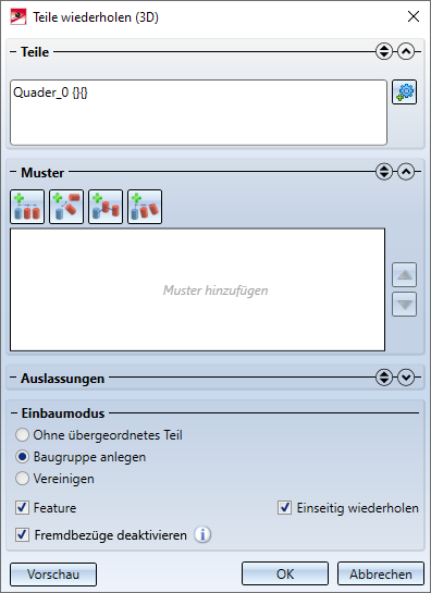 Ist die Checkbox aktiv, dann wird für die Wiederholung ein Feature angelegt. Das Feature Teilewiederholung wird immer der übergeordneten Baugruppe bzw. beim Vereinigen der Zusammenfassung zugeordnet. - Fremdbezüge deaktivieren
