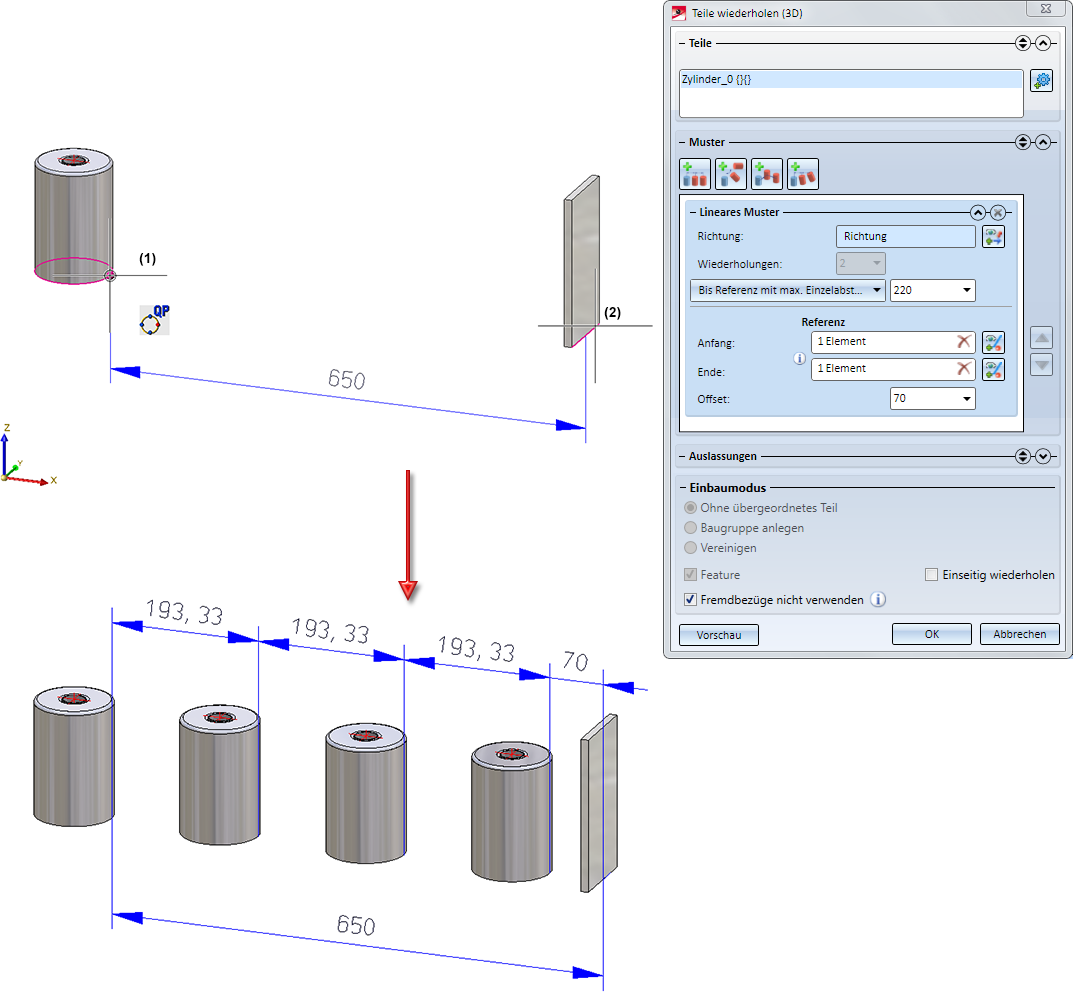 Hier wird der Abstand zwischen dem Original und der letzten Wiederholung durch den Abstand zweier Referenzelemente bestimmt. Die Anfangsreferenz muss ein Punkt sein, die Endreferenz ein Punkt, eine Kante oder eine Fläche. Die Anzahl der Wiederholungen wird dann anhand des eingegebenen Abstandes und des ermittelten Referenzabstandes automatisch ermittelt. Zusätzlich kann hier ein Offset für die letzte Wiederholung angegeben werden. Deren Abstand von der gewählten Endreferenz ist dann die Summe aus angegebenem Abstand und Offset.