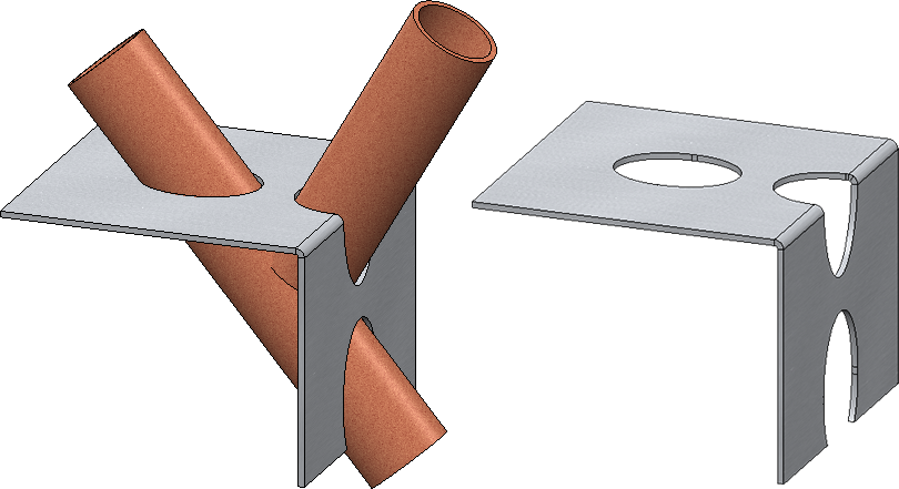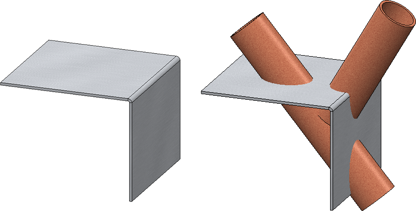 Mit dieser Funktion lassen sich Kollisionsteile, d. h. Teile, die das aktive Teil durchdringen, vom aktiven Teil subtrahieren. Dabei können Sie bei Bedarf gezielt festlegen, welche Flächen beim Bereinigen berücksichtigt werden sollen. Dies kann beispielsweise sinnvoll sein, wenn Laschen oder Biegezonen eines Kantbleches von der Bearbeitung ausgeschlossen werden sollen. Darüber hinaus können - im Unterschied zur normalen Subtraktion - die Flächen des aktiven Teils ausgewählt werden, zu denen das durch die Durchdringung entstehende Loch senkrecht stehen soll.