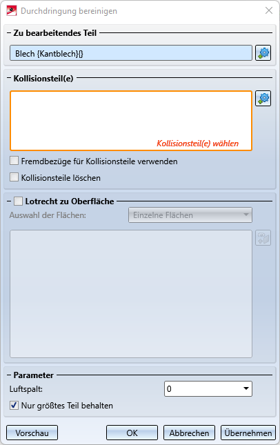 - Ist das aktive Teil ein Blechteil, dann wird beim Aufruf dieser Funktion automatisch die Funktion Durchdringung bereinigen aus der Registerkarte Kantblech gestartet.