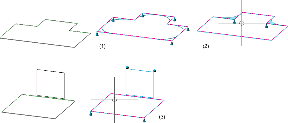 (1) Gewählte Fläche, (2) tangential anschließende Kanten, (3) Runden ohne tangentiale Fortsetzung, (4) Runden mit tangentialer Fortsetzung,
