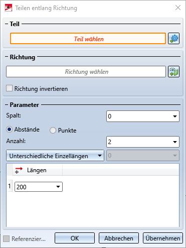 Zur Bestimmung der Länge der Teilstücke stehen in der Auswahlbox verschiedene Möglichkeiten zur Verfügung. Beachten Sie dabei bitte, dass die Gesamtlänge der entstehenden Teilstücke + Spalt immer der Gesamtlänge des Ausgangsteils entspricht. Das bedeutet, dass die Länge des letzten Teilstücks automatisch berechnet wird und von der angegebenen Einzellänge abweichen kann.