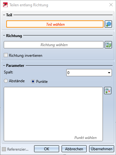 Ist ein Teil ausgewählt, dann ist automatisch das Feld Richtung wählen aktiv (farbig markiert). Bestimmen Sie dann die Richtung, in der die Teilung erfolgen soll. Dies kann durch die Auswahl zweier Punkte, einer Kante oder eine Fläche erfolgen. Wird eine Fläche gewählt, dann wird als Richtung die Flächennormale verwendet. Die gewählte Richtung wird durch ein farbigen Pfeil in der Konstruktion visualisiert.