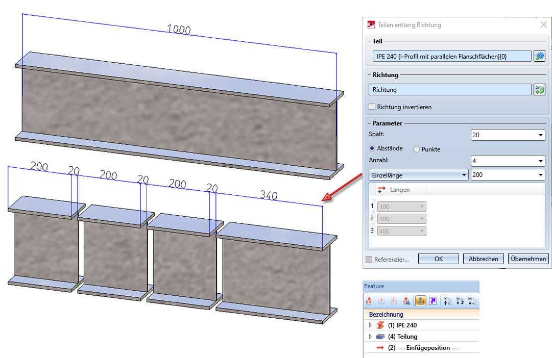 Mit dieser Funktion lassen sich Teile entlang einer Richtung in mehrere Abschnitte teilen. Dabei stehen verschiedene Teilungsoptionen zur Verfügung, beispielsweise können die einzelnen Teile unterschiedliche Längen haben. Darüber hinaus wird bei dieser Funktion ein entsprechendes Feature angelegt, so dass sich die Teilung auch nachträglich noch bearbeiten lässt.