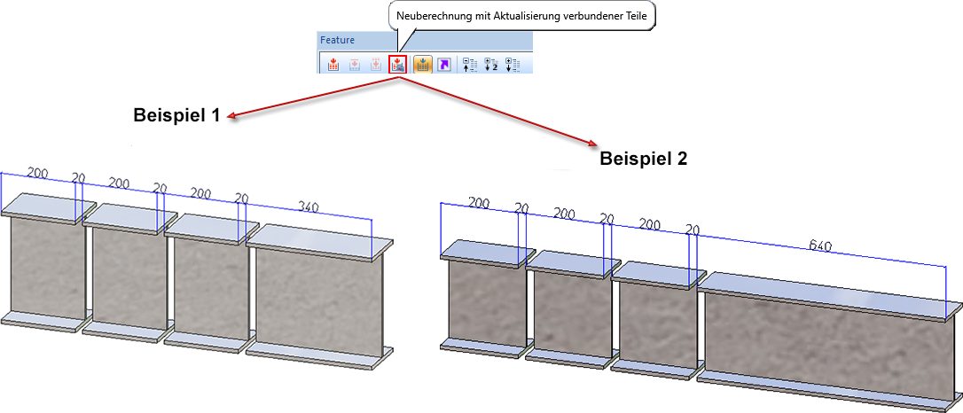 Um auch die anderen Teilstücke zu aktualisieren, verwenden Sie die Feature-Funktion Neuberechnung mit Aktualisierung der verbundenen Teile