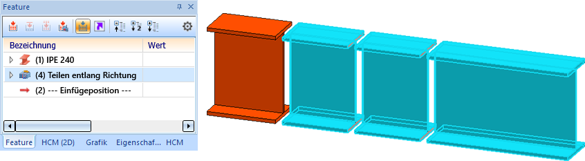 Bei Stahlbauprofilen wird automatisch die Profilachse als Teilungsachse vorgeschlagen. Bei der 3D-Funktion verläuft die Richtung vom Anfangs- zum Endpunkt der Profilachse. Bei der Stahlbaufunktion wird die Richtung durch die aktuelle Cursorposition beim Aufruf der Funktion bestimmt.