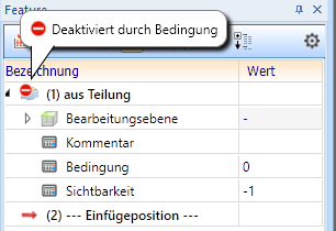 - Wird ein Feature durch Setzen der Bedingung 0 deaktiviert, dann wird dies am Feature durch ein entsprechendes Symbol gekennzeichnet.