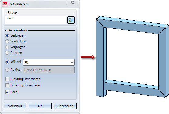 Als Skizze wird die Skizze unter (2) gewählt. Die Verbiegung soll 90° betragen. Die Aktivierung anderer Optionen ist hier nicht erforderlich. In diesem Fall liefern die lokale und globale Verbiegung dasselbe Ergebnis.