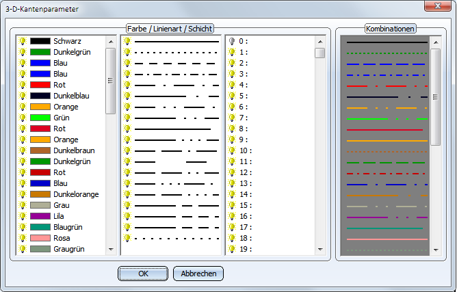 Mit dieser Funktion ändern Sie die Voreinstellung der Kantenparameter. Dies sind die Farbe, Linienart und Schicht sowie Kombinationen dieser Werte. Die Einstellungen werden bei schattierter Darstellung nicht berücksichtigt.