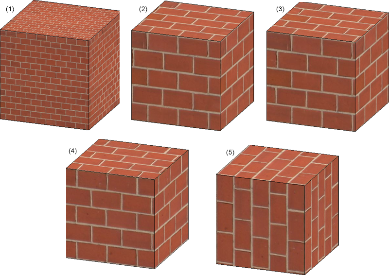 Beispiel mit Projektion Quader: (1) Ausgangstextur mit Projektion Quader, (2) Skalierungsfaktor 3, (3) Horizontal verschoben, (4) Vertikal gespiegelt, (5) Rotation 90° |