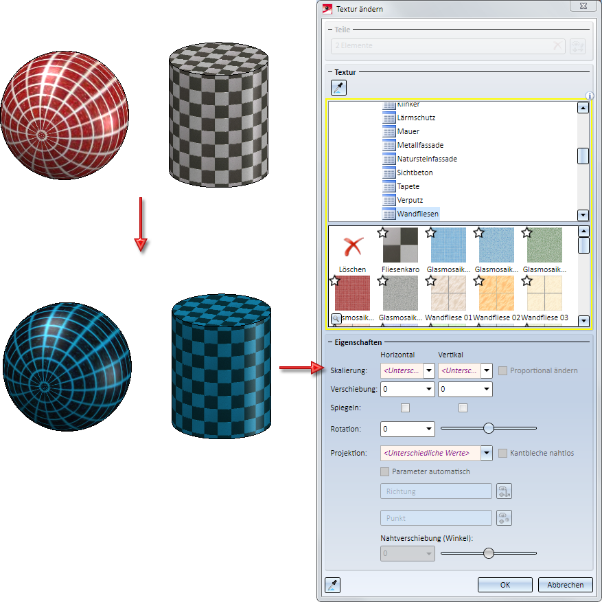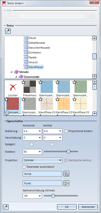 - Gelten für die gewählten und bereits texturierten Elemente dieselben Einstellungen, dann werden diese im Dialogfenster angezeigt.